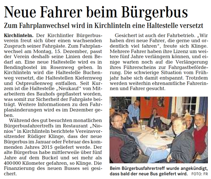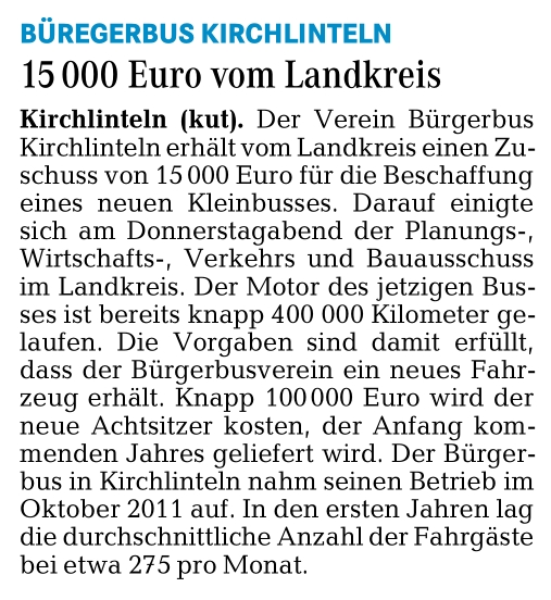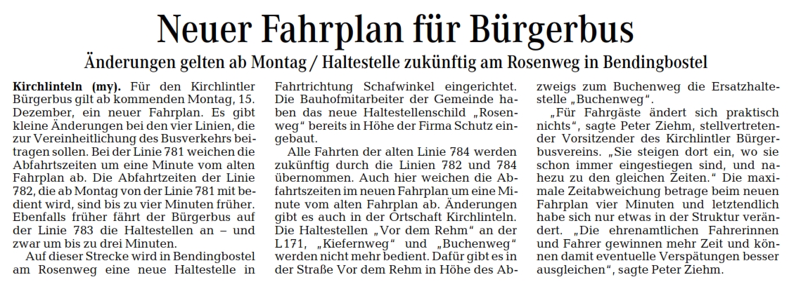 | Neuer Fahrplan für den Kirchlintler Bürgerbus . . . VN vom 11.12.2013 | weiterlesen |