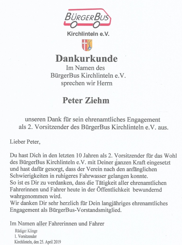 erhielt eine Urkunde vom BürgerBusverein mit einem Dank für sein
