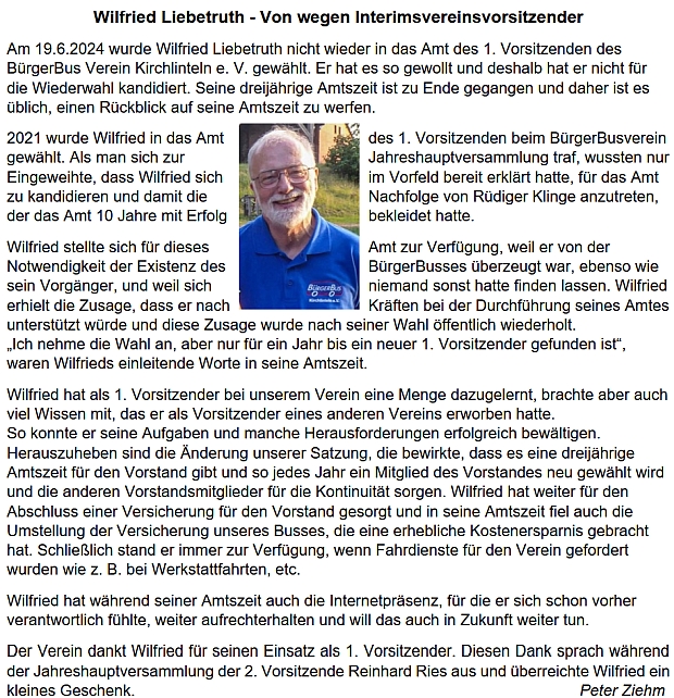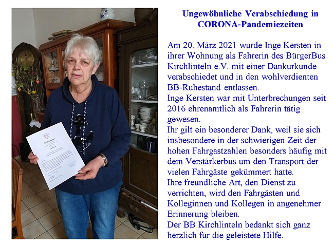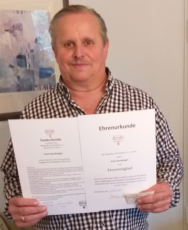 Erich Gansbergen Ehrenmitglied![]() Seit vielen Jahren schon war er als ehrenamtlicher Fahrer tätig und hätte eigentlich eine Goldmedaille verliehen bekommen müssen. Er hatte sich sehr ernsthaft für die Pflege des Busses, die Überprüfung der Funktionen, die Reparaturtermine, die Fahrbereitschaft und die Organisation der Ersatzbusbeschaffung gekümmert und auch nie den TÜV vergessen. Zuletzt hatte er auch noch die Fahrer*Innen-Ausbildung übernommen. Dabei hatte er stets mentale und digitale Unterstützung von seiner Ehefrau Sabine erfahren. Der BürgerBusVerein Kirchlinteln bedankt sich ganz herzlich für die ehrenamtliche Arbeit in den zurückliegenden Jahren mit einer Dankurkunde. Erich Gansbergen wurde in der Jahreshauptversammlung am 29. Juni 2021 einstimmig zum Ehrenmitglied ernannt und bekommt deshalb eine Ehrenurkunde. Diese Auszeichnung erfolgt in Anerkennung und Würdigung seiner langjährigen unermüdlichen Einsatzbereitschaft und Aktivität für den Verein und seiner besonderen Verdienste um den Verein. (18.08.2021) |